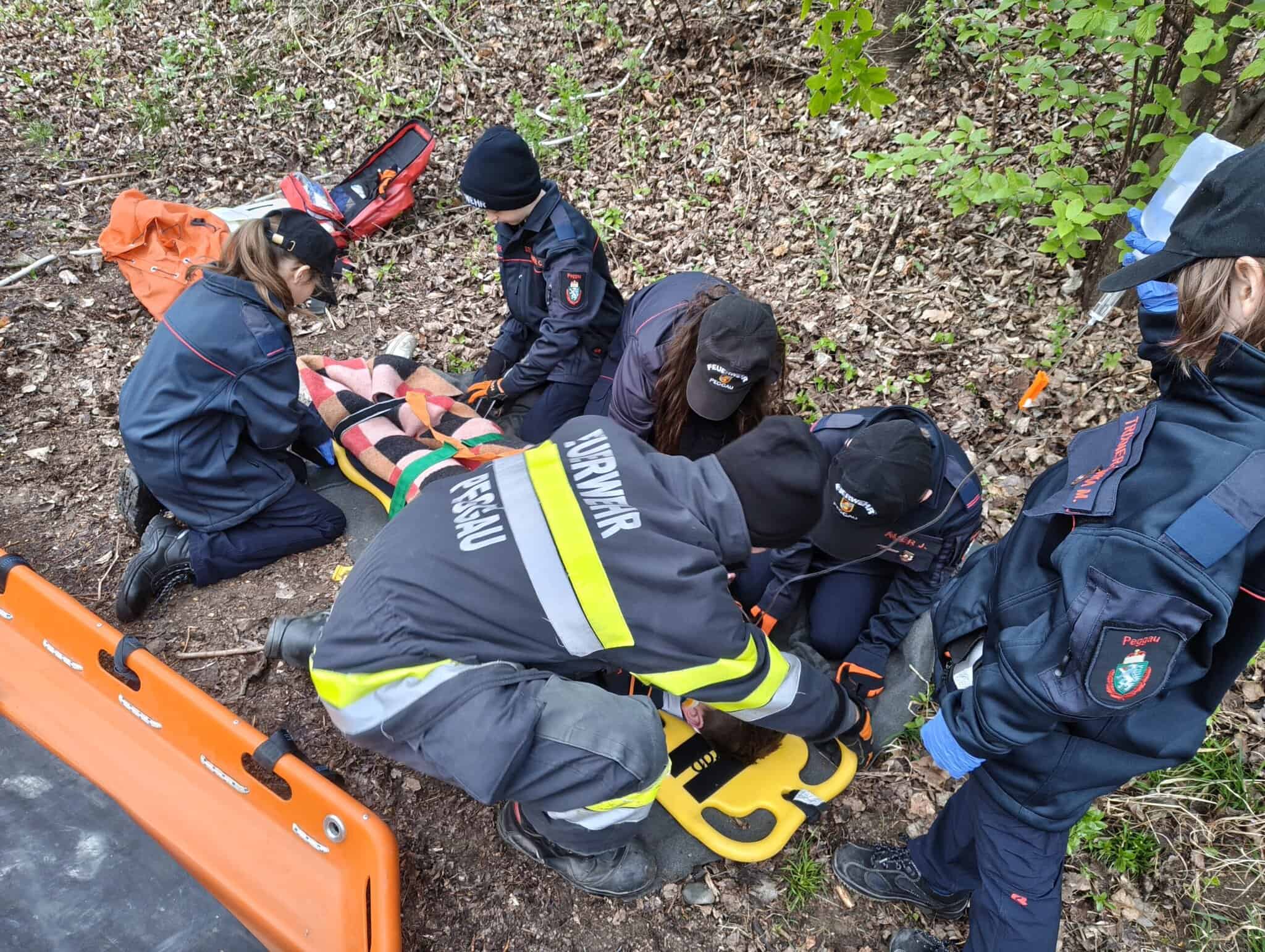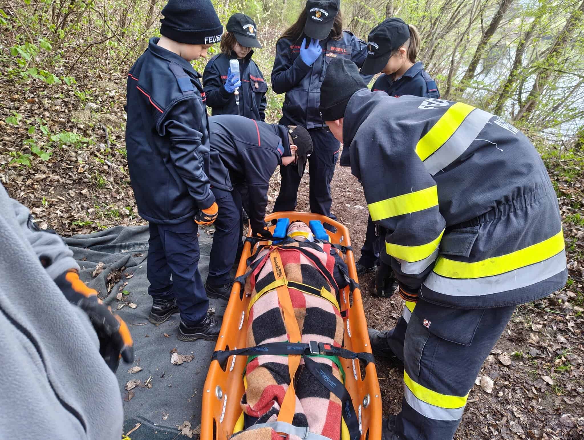 Bei der ersten diesjährigen Freiluftübung ging es um das Thema Menschenrettung. Eine gestürzter Person beim Murwanderweg musste erstversorgt werden und danach über eine Böschung zum Patientensammelplatz gebracht werden. Dazu wurde zuerst eine Gruppeneinteilung durchgeführt und die Aufgaben erklärt. Im ersten Schritt galt es nun, eine blutende Unterarmwunde zu versorgen und auch ein Stiffneck anzulegen. Danach wurde die Person auf ein Spineboard aufgeschaufelt und in die Korbtrage verbracht. Ein besonderes Augenmerk wurde dabei auch auf das richtige Anlegen der einzelnen Gurte gelegt. Im Anschluß wurde die Korbtrage mittels Rettungsleine (und Sicherungsleine) und Umlenkrolle über eine Böschung zum Sammelplatz gezogen. Auch hier war wieder Teamwork gefragt. Als Abschluß wurde die verletzte Person dann mittels Korbtrage über rund 400m bis zur Feuerwehr getragen. Ziel der lehrreichen und abwechslungsreichen Übung war das Kennenlernen der Sanitätsmaterialien, die unterschiedlichen Tragehilfen und vor Allem das Teamwork und die Aufgabenteilung.